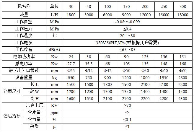 Z系列變壓器油高效真空濾油機技術參數: